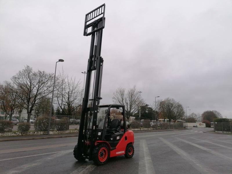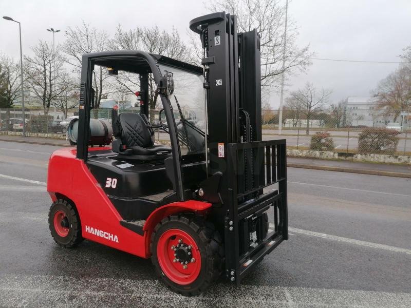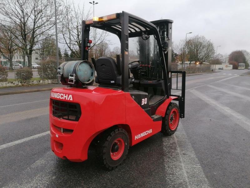 Chariot élévateur à gaz Hangcha XF30G de 3 tonnes, année 2021, avec seulement 543 heures. Mât triplex 5 m, déplacement latéral, pneus plein souple. Performant, fiable et économique (LPG), disponible immédiatement.