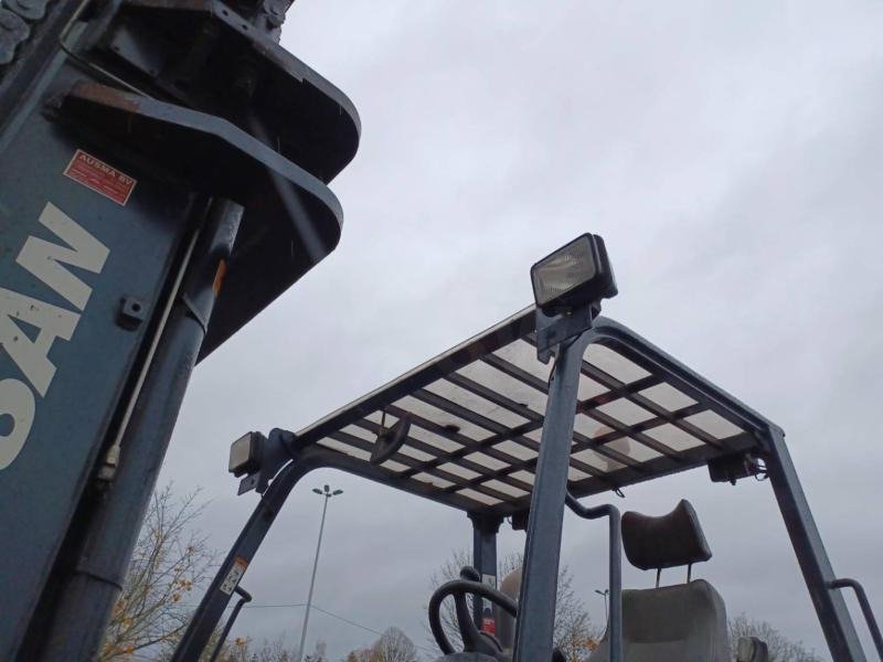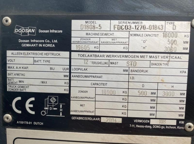 Chariot élévateur diesel Doosan D1808-S – 18 tonnes, année 2014, avec seulement 1 951 heures. Équipé d’un mât duplex, fourches 1,57 m et pneus plein souple. Puissant, stable et idéal pour la manutention lourde en environnement industriel ou chantier.