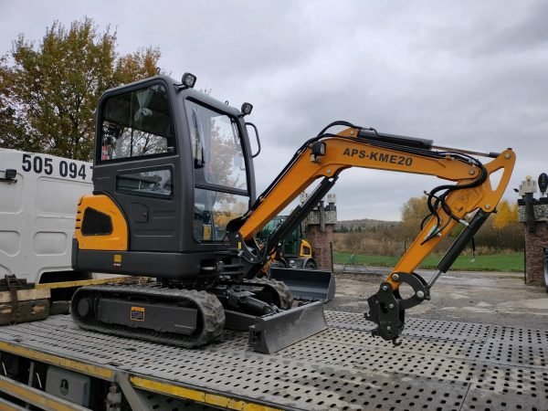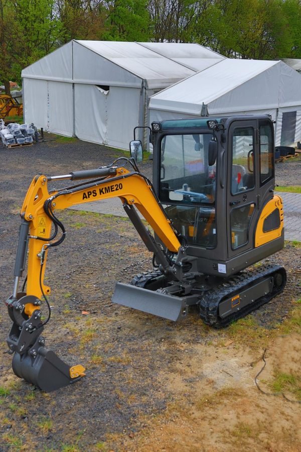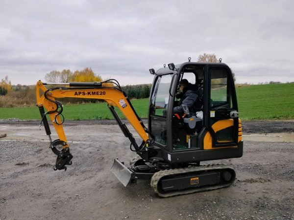 Mini-pelle APS KME20 compacte et performante (2 t), moteur 20 ch, idéale pour le terrassement et les travaux en zones étroites.