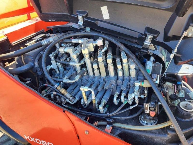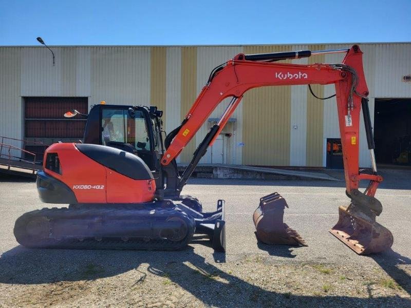 Mini-pelle Kubota KX080-4 – 2021, 1 689 h, attache rapide hydraulique, 3 godets, ligne BRH, climatisation, caméra de recul. Prête à travailler.